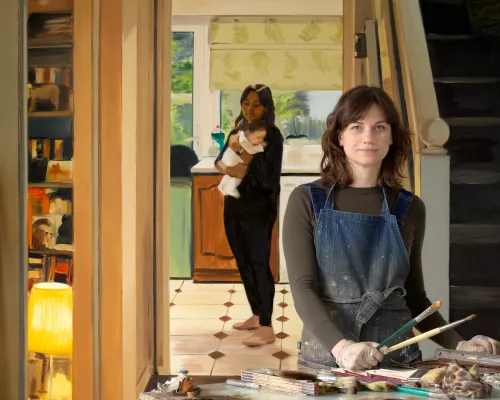The places and people in my paintings are nearly always ‘real’ but it’s only been in the last 6 or 7 years that these people have been seen in their own environment, and being themselves rather than playing a character. Since 2019 I’ve been focusing more often on people that are part of my family, or immediate day to day life. That’s included my mother, Lisa, and most recently the women who look after my daughter at nursery, or our health visitor, who is depicted weighing my baby son in ‘Sarah Weighing Laurie’ which is in the exhibition.