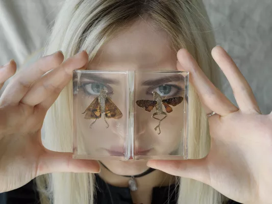 Margarita Ivy (*1998) is a multimedia Ukrainian artist living in the Czech Republic. Ivy reflects on questions about life and death, about the predetermined death of every living being. She interprets the borderline existential questions through romanticizing compositions of epoxy objects. Deceased animals, often found in nature and in the city, are preserved and protected from biological processes. He keeps some of them for years in containers of formaldehyde before deciding to encase them in epoxy forever. Often she attaches pieces of fabric with traditional Ukrainian embroidery, which reminds the artist of her family's tradition of using embroidery on clothing or bedding. She links the theme of mortality with the memory of place - in her thoughts she returns to her native Zaporozhye, recalling the stories of her grandmother and the history of her family.