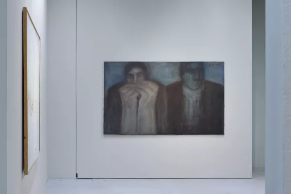 Květa Valová's Signal IV: The Eighties features the work Waiting (1986). The work is dominated by two massive human figures of a man and a woman, probably from the working class. The woman has her palms placed in front of her mouth, symbolizing fear or even dismay, whereas the male figure has a static detached expression with apparent disinterest or resignation. Both figures convey a strong psychological undercurrent of the times in which both subjects lived - i.e., fear of possible changes that may not turn out as expected (the woman) and loss of hope for a better future (the man).