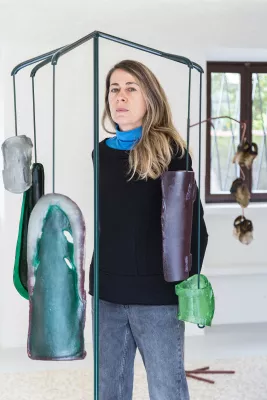 Svoje objekty často různými způsoby zavěšuji dolů ze stropu, protože mě zajímá vertikálnost, která se vztahuje k lidskému tělu – jako lidé existujeme a jednáme ve vertikální poloze. Sochy visí na různých strukturách, které jsou jejich součástí, a odkazují tak na pocit závislosti, připoutanosti a zranitelnosti... Myslím, že jednou z charakteristik práce se sklem je určitá fluidita a organičnost, která se pojí s jeho transparentností. Jak už jsem zmínila, důležitým aspektem je pro mě práce s protikladnými situacemi a vlastnostmi, třeba fluiditou těla a industriálními vlastnostmi objektů, které to tělo „konstruují“.