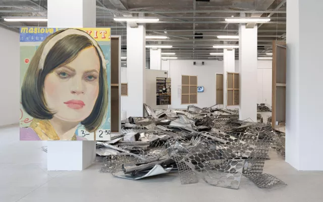 Drawing inspiration from the iconic 1970s Czechoslovak TV series Žena za pultem (Woman Behind the Counter), the exhibition juxtaposes figurative works with a scenographic display and a film installation that evoke the atmospheres of shop interiors and domestic workspaces. The gallery’s scenography incorporates industrial machines, sculptural and stainless-steel elements, and spatial mise-en-scène, extending the reflection on modern labour and gendered memory. A newly produced video work complements the installation, introducing the project through the voices and faces of the three participating artists. Presented amidst piles of scrap metal and staged compositions, the video explores scale, memory, and post-socialist transformation through a feminist lens.