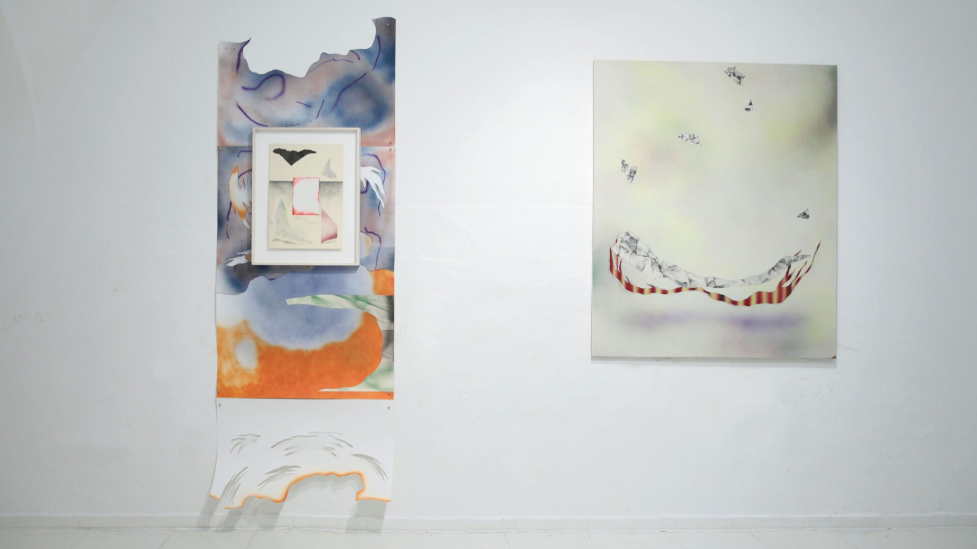 U Rity Koszorús (1989) je tento vstup do prostoru přirozeným pokračováním toho, čemu se ve své tvorbě věnuje už delší dobu. Bratislavská umělkyně, která v roce 2021 získala cenu VÚB Maľba roka, ve svých dílech propojuje malbu, koláž i netradiční materiály a záměrně tím narušuje zažité způsoby vnímání. Její práce se pohybují mezi abstrakcí, fragmentem a osobním vizuálním vyprávěním, místy až se snovým nebo lehce surrealním nádechem. Důležitou roli v nich hraje vrstvení, iluze a práce s koláží, kterou nevnímá jen jako techniku, ale i jako princip skládání paměti a zkušenosti. Také proto její tvorba často překračuje hranici klasického dvourozměrného obrazu a vstupuje do prostoru. Skrze formu pak otevírá témata nostalgie, paměti, identity, hledání životních jistot i křehkosti domova.
