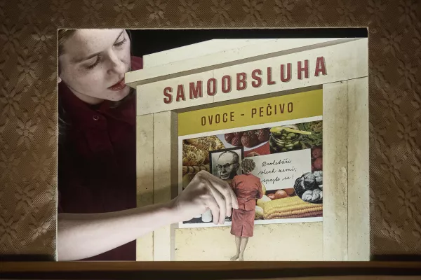 Vše se odehrává na malé scéně, kde roztomilá papírová loutka – skoro jako vystřižená z dobového časopisu o módě – prochází sídlištěm, frustrací ze stání ve frontě na banány, metrem a výlohami obchodního domu Kotva. Zahraničními designy se tu snoubí s autentickými detaily jako portréty Husáka a hesla, která dnes znějí spíš jako vtip. Celé to působí jako mix pastelových barev a absurdních momentů, které dávají dohromady trochu nostalgický, ale taky kritický pohled na dobu, která byla všude kolem normalizace.